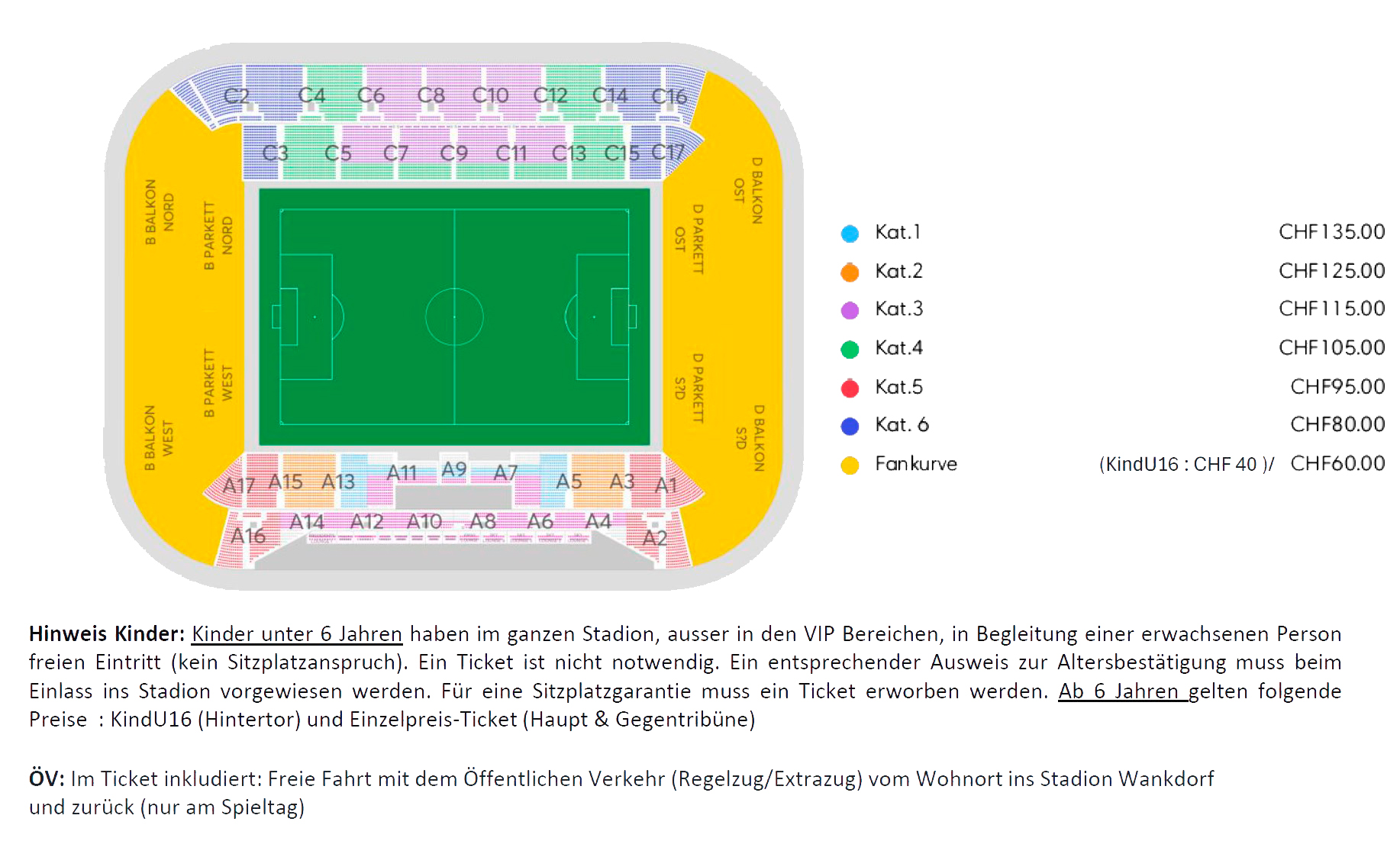 Auf folgendem Bild sind die Kategorien und Preise ersichtlich. In jedem Matchticket ist die An- und Rückreise mit dem öffentlichen Verkehr vom Wohnort bis ins Stadion Wankdorf eingeschlossen.
