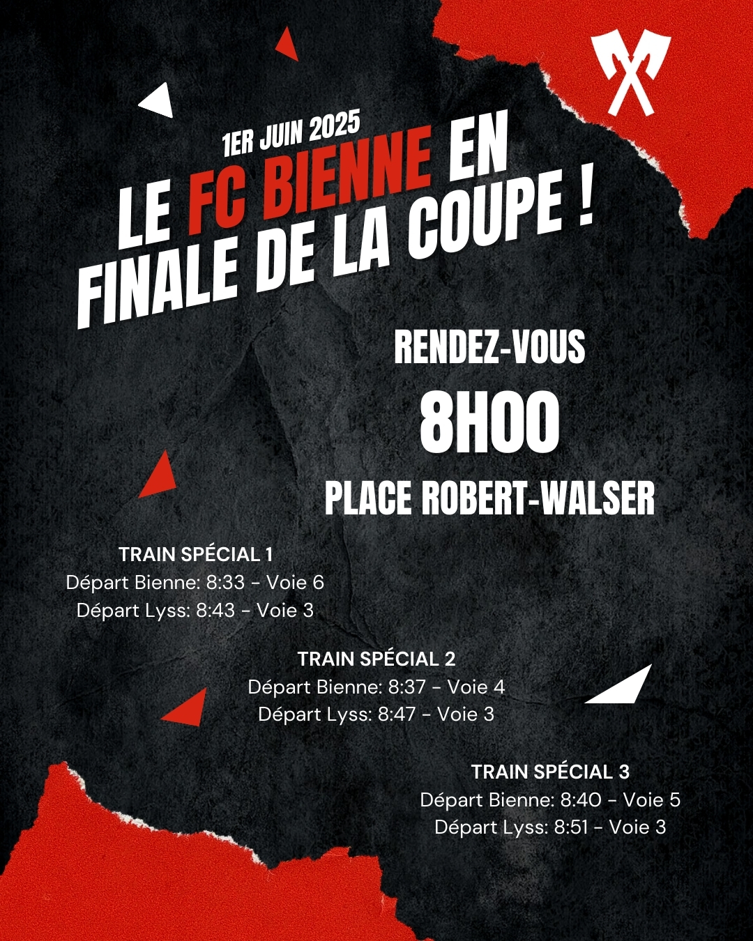 Tous-tes les supporters-trices se retrouveront à 08h00 sur la place Robert-Walser (derrière la gare) et se rendront ensuite au point de rencontre dans le centre-ville de Berne à bord de 3 trains spéciaux. Les trains s'arrêtent également à Lyss et circulent comme suit :